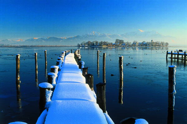 Zauberhafte Winterstimmung herrscht am Chiemsee – hier der Blick auf die Fraueninsel. – Foto: Priener Tourismus GmbH