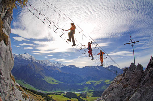 Kondition, Mut, Ausdauer, Kraft und Können – all das benötigen Bergfexe auf den Klettersteigen und Routen rund um Engelberg in der Zentralschweiz. Das Klosterdorf auf 1000 Metern Höhe ist umgeben von Almen und saftigen Wiesen, eingebettet in eine schroffe Bergwelt – alles überragend der Titlis-Gletscher mit seinen 3238 Metern.