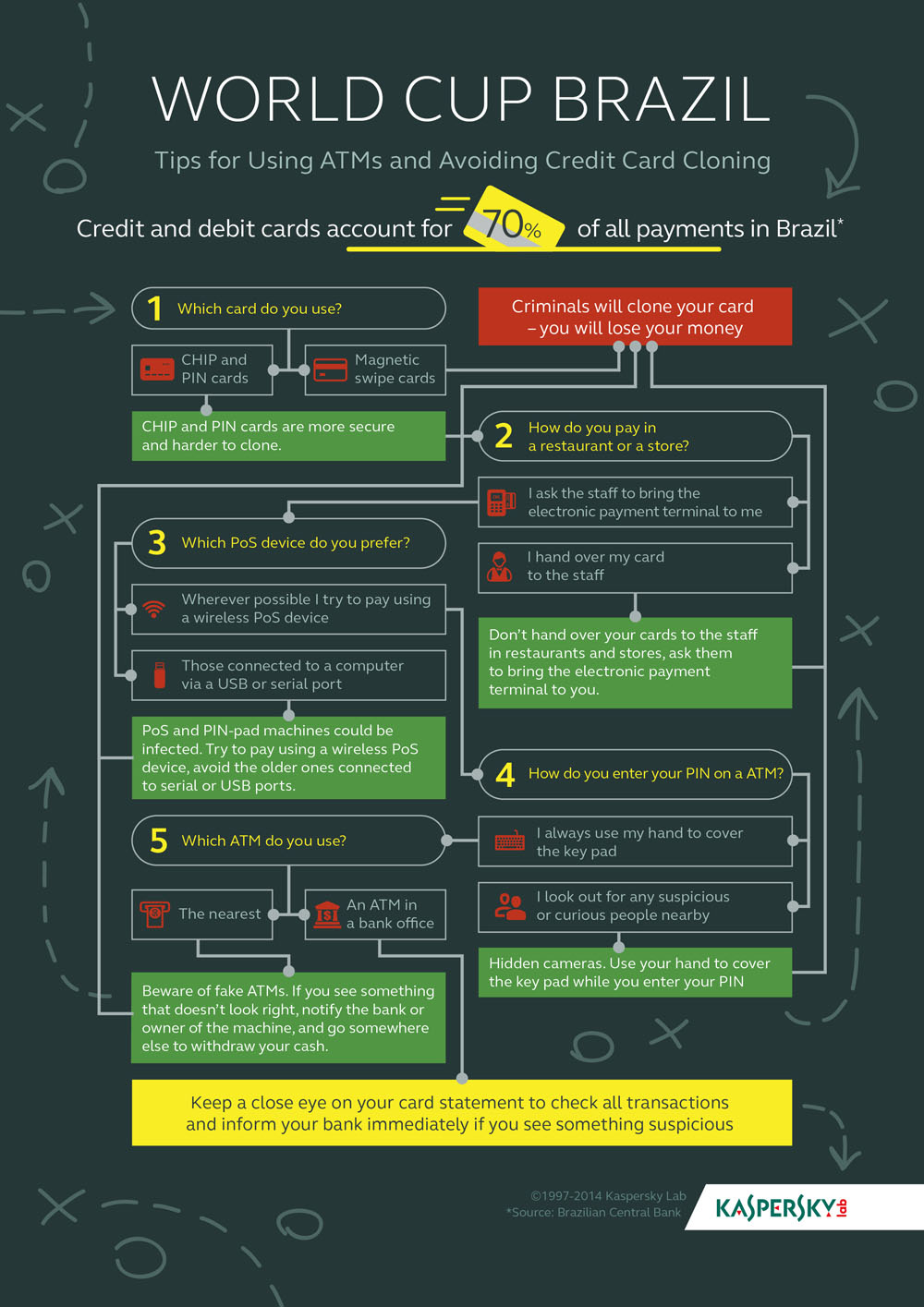 Kaspersky Lab rät daher Touristen in Brasilien – insbesondere zur Fußball-WM – zu folgenden Vorsichtsmaßnahmen beim Umgang mit Bank- und Kreditkarten: