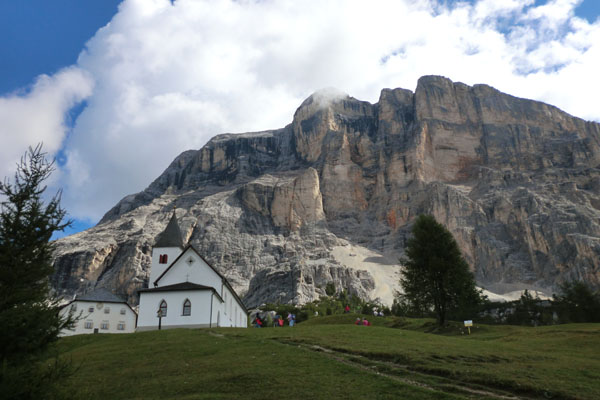 Bei der Tour GourMete Tradition handelt es sich um eine Höhenwanderung direkt unter den majestätischen Felsen des Heiligkreuzkofels. – Foto: Dieter Warnick