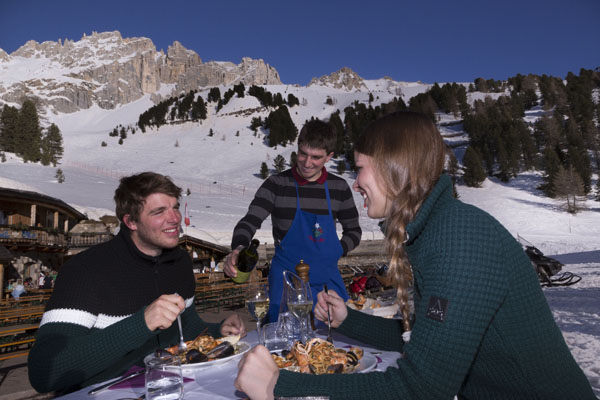 Genussabfahrten und beste Kulinarik vor Dolomiten-Panorama im Ski Center Latemar-Obereggen. – Foto: Eggental Tourismus