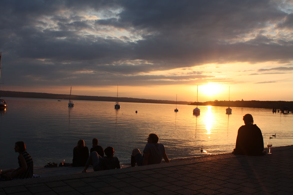 Vor der „Bayrischen Brandung“ in Herrsching, wo Diller um 19.10 Uhr zum letzten Mal an diesem Tag anlegt, ist es stattdessen das Gitarrenspiel eines Hobbymusikers, das die friedliche Abendstimmung auf der Promenade untermalt. Die Menschen, die hier die Beine vom Ufermäuerchen baumeln lassen, auf dem Steg lümmeln oder im Kies hocken, sind ein bunt gemischter Haufen: Einheimische, die den Feierabend zelebrieren, Besucher vom anderen Seeufer, die mit kleinen Segelboten zum Sonnenuntergang extra ans Ostufer schippern, sowie verwunderte Urlauber, die einen dermaßen unprätentiösen Kiosk wie die „Brandung“ eher auf Bali als in Bayern verorten würden.