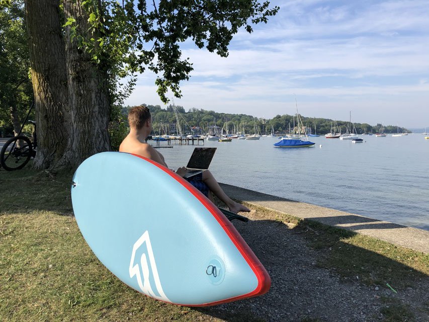 Bundespräsident Roman Herzog sprach 1998 von einer geglückten „Symbiose aus Laptop und Lederhose“, als er den Wandel Bayerns vom Agrar- zum Hightech-Standort charakterisierte. Für diesen Herrn gilt eher das Motto „Laptop und Surfbrett“. – Foto: Kunz-PR