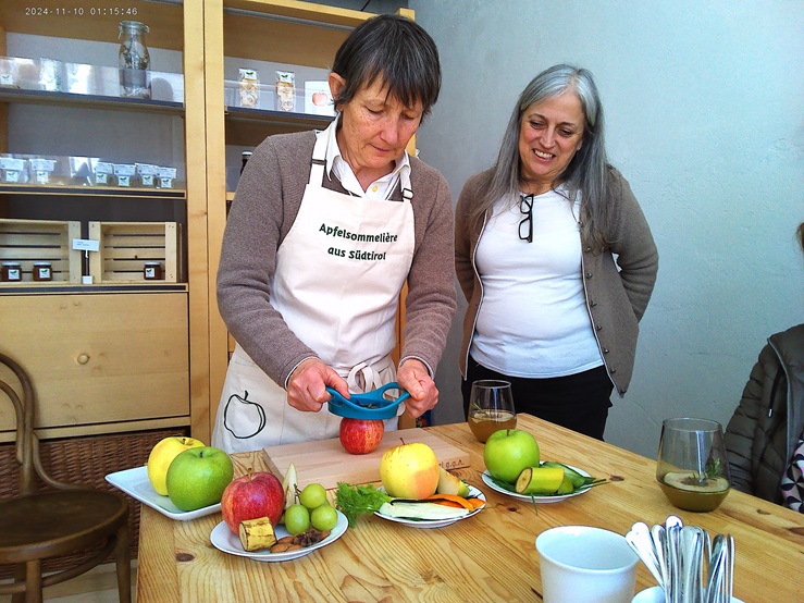 Apfel-Botschafterin Margot Innerkofler (links) und Marina Papadopoli vom Hofladen Emma con Gusto wissen alles, was man über Äpfel wissen muss, mosten herrliche Apfelsäfte, kreieren schmackhafte Marmeladen, Fruchtaufstriche und Chutneys und stellen auch Apfelchips her. – Foto: Dieter Warnick