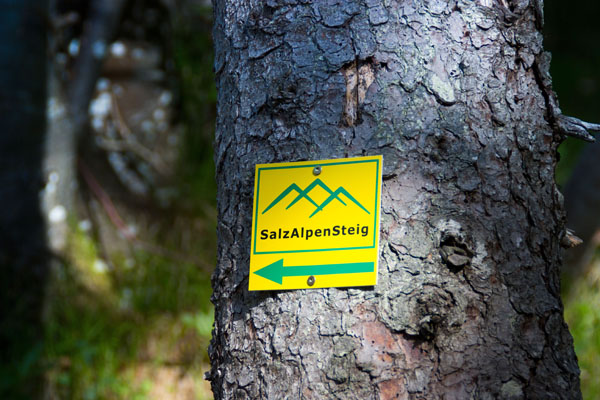Im Vorübergehen gewinnen Wanderer Einblicke in die einzigartige Geschichte der Landstriche. Grüne Bergspitzen auf gelbem Untergrund – SalzAlpenSteig-spezifische Markierung an Bäumen, Schildern und Pfosten – weisen vor Ort den Weg.