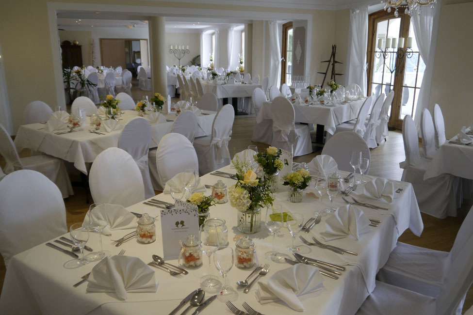 Festlich gedeckt ist die Hochzeitstafel; das Brautpaar mit Gefolge kann kommen. – Foto: Hotel Gut Edermann