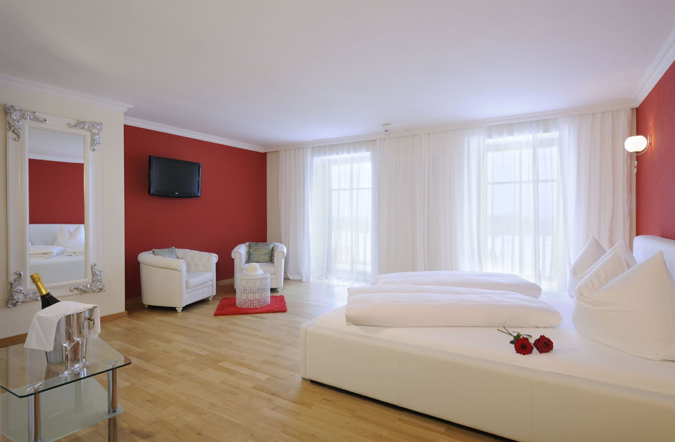 Die „TraumArtDeluxe“-Doppelzimmer sind zwischen 35 und 42 m² groß und verfügen über einen großen Südbalkon mit traumhaftem Blick in die Berge. Wählen kann der Gast zwischen Whirlpool oder Wasserbett. – Foto: Hotel Gut Edermann