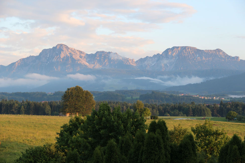 In den Chiemgauer Alpen, speziell im Hotel Gut Edermann, lässt es sich vortrefflich urlauben. Hier ein Blick zum Hochstaufen, der sich zwischen Bad Reichenhall, Piding und Anger erhebt, sowie dem Zwiesel, einem Berg nordwestlich von Bad Reichenhall; es ist der höchste Gipfel des Gebirgsstocks Staufen. – Foto: Hotel Gut Edermann