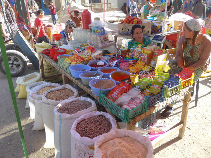 Nachmittags erleben wir auf dem Basar die neue Ausrichtung Tadschikistans: China. Der Handel blüht, Khorogh ist Umschlagplatz für Waren, die seit der Öffnung des Grenzübergangs 2001 über den Pamir Highway nach Westen gebracht werden. Immer mehr Traditionelles wird durch Plastik ersetzt – die schönen Zinnkannen zum Wasserholen finden wir nicht mehr. Dafür sind die Waren auch für Einheimische erschwinglich.