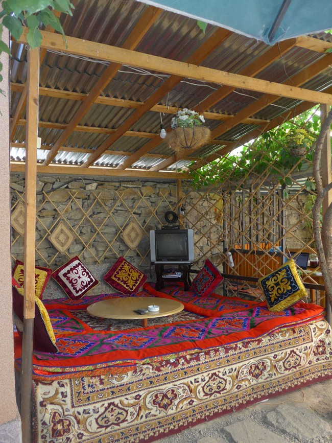 Weiter geht es, unser Tagesziel liegt noch einige Kilometer südöstlich: in Yamchun erwartet uns Alisho in seinem Homestay (auf 3.100 m), einem alten Pamirhaus. Der Raum ist ganz mit Teppichen ausgelegt, auch an den Wänden halten Teppiche die Kälte ab. Gegessen wird auf einem erhöhten Podest, auf das ein niedriger runder Tisch gestellt wird. Eigentlich werden zum Essen die Füße untergeschlagen, als Europäer kann man aber auch mogeln und sie unter dem Tisch verschwinden lassen. Zum Schlafen wird der Tisch entfernt und Matten auf das Podest gelegt – oder man schläft draußen auf dem Tapchan.