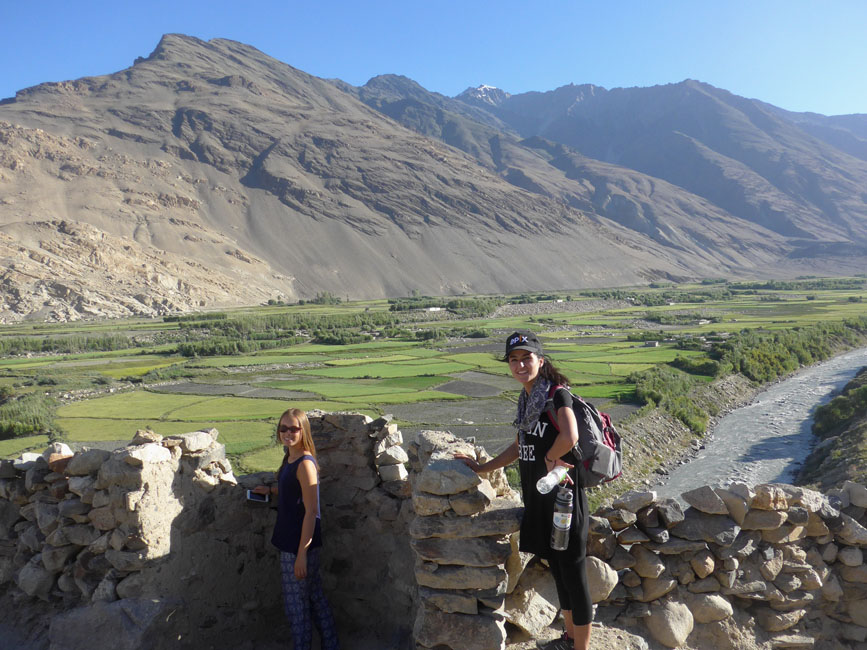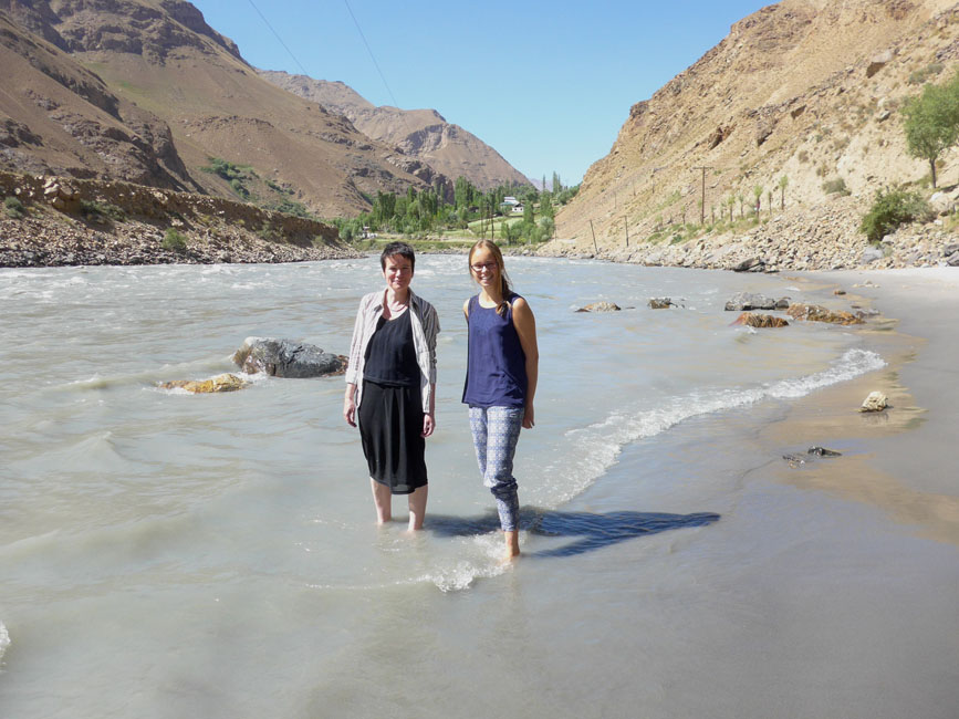 Am nächsten Tag geht es weiter Richtung Yamchun im Wakhan-Korridor, wieder 180 km entlang der afghanischen Grenze. Die Sandstrände am Panj laden zu einem Picknick ein. Trotz Badeverbot kann man mit den Füßen eintauchen. Und das reicht – das Wasser ist eiskalt. Eine schöne Erfrischung an einem heißen Tag. Weiter gen Süden sehen wir dann kurz vor Ishkashim zum ersten Mal den Hindukusch. Es ist ein atemberaubender Anblick: der Panj mit seinen Stromschnellen, die grünen Flusstäler mit Weiden und Bäumen, die kahlen Berge und im Hintergrund die schneebedeckten Gipfel. Kurz hinter Ishkashim steht die Ruine der Festung Qakha aus zoroastrischer Zeit (ca. 3. Jh. v. Chr.).