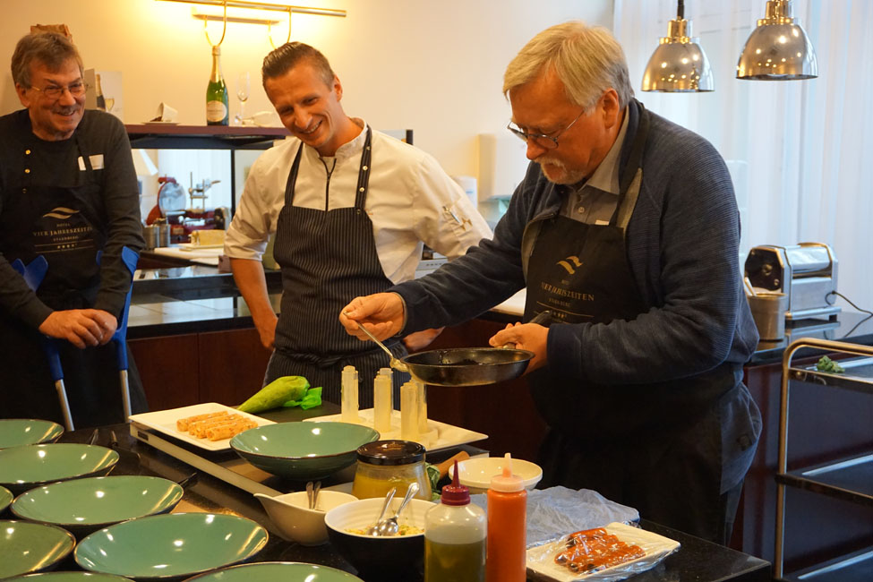 Kochkurs unter „Sterneaufsicht“ – Maximilian Moser (Mitte) bereitet es große Freude, Hobbyköchen bei der Arbeit zuzusehen.