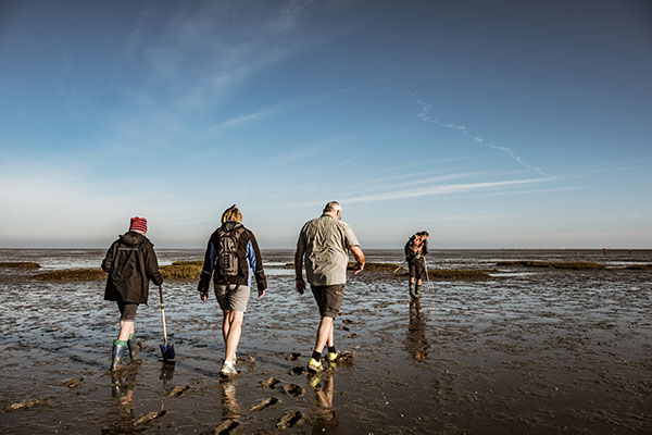 Bei geführten Touren im küstennahen Watt erfahren die Teilnehmer mehr über die lange Reise der Vögel und warum das Wattenmeer so wichtig für sie ist. Zum Beispiel bei einer Wanderung in den Sonnenuntergang mit Wattführerin Jessica Supthut im Küstenbadeort Neßmersiel. Mit etwas Glück beobachtet die Gruppe (etwa zehn Teilnehmer), wie Tausende Gänse zu ihren Schlafgewässern fliegen oder wie dichte Wolken arktischer Watvögel über den Salzwiesen aufsteigen.