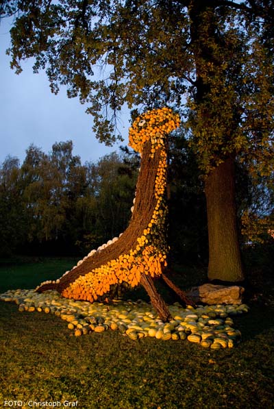 Alles Kürbis oder was? Der stimmungsvolle Rahmen, wie hier eine beleuchtete „Kürbis-Giraffe“, verzückt die Besucher im Retzer Land. – Foto: Christoph Graf