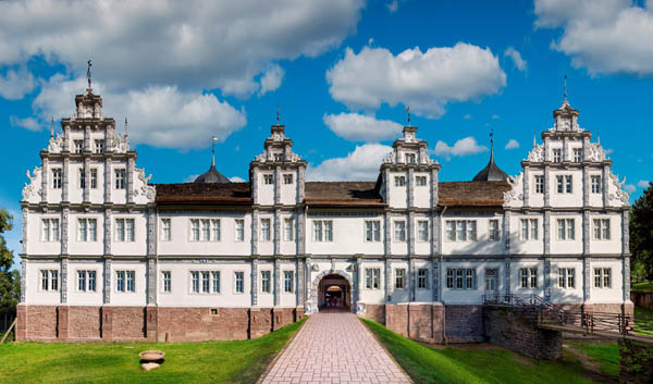 In strahlendem Weiß und Blau präsentiert sich jetzt wieder die Hauptfassade des Weserrenaissance Schlosses Bevern. Mit finanzieller Unterstützung der EU erhielt das Schloss im letzten Jahr die polychrome Originalbemalung aus der Zeit seiner Entstehung zurück. Die 1603-12 von Statius von Münchhausen erbaute vierflügelige Schlossanlage im Landkreis Holzminden gilt als eines der prächtigsten Baudenkmäler im Weserraum. Sie dient heute das ganze Jahr über als wunderschöne Kulisse für Ausstellungen, Konzerte, Open-Air-Theateraufführungen und multimediale Inszenierungen.